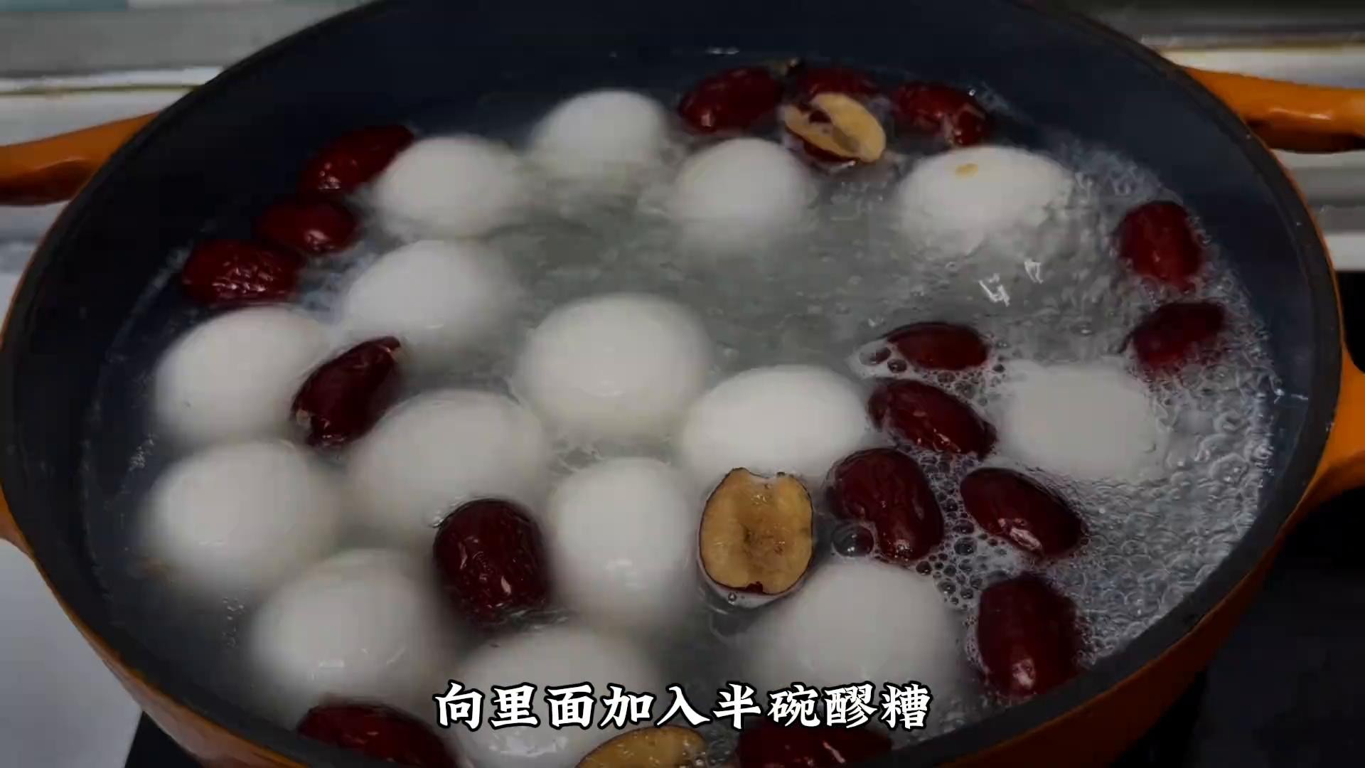 ·煮至汤圆沸腾后,下面一步也非常的关键。加入半碗冷水,再向里面加入一把红枣。再次煮开锅后,向里面加入半碗醪糟,一块红糖,不喜欢也可以不放。记住全程不要加热水。这样做的目的: