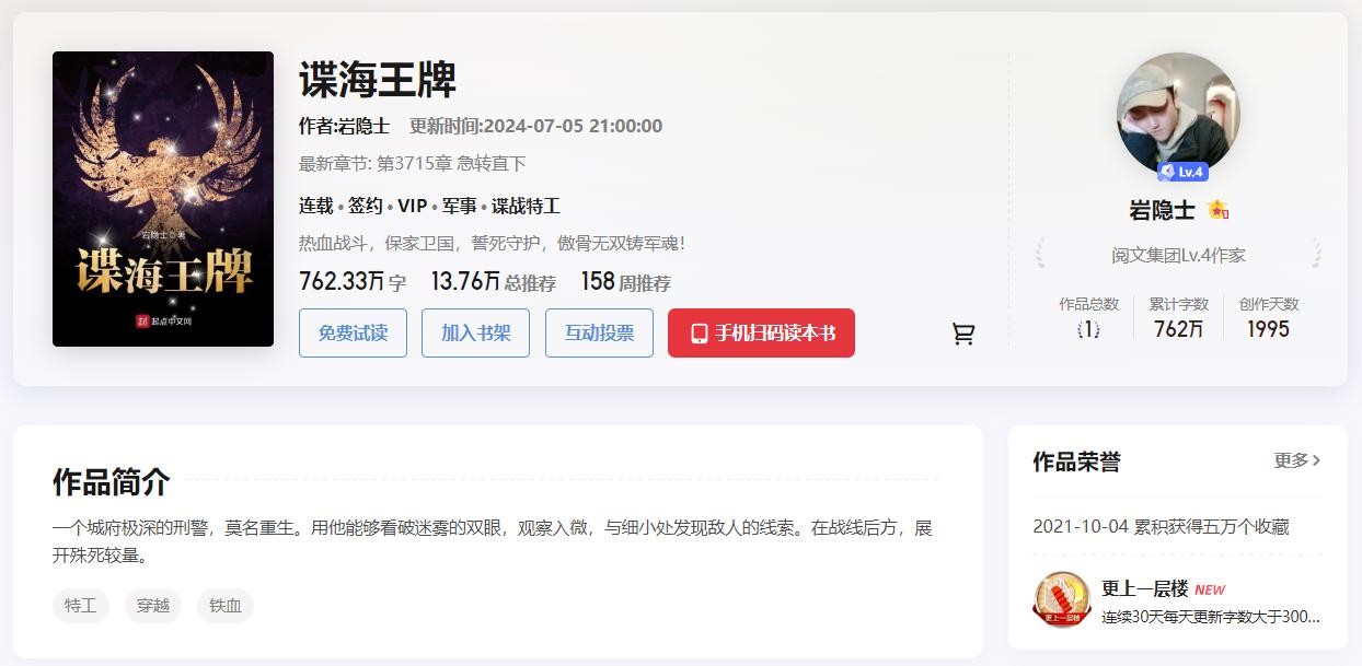 小说发布于2019年1月16日,到现在已经连载了5年半的时间,总字数762万,连载到了3718章。作者现在每天更新4000+的字数,就是不知道什么时候能完结。