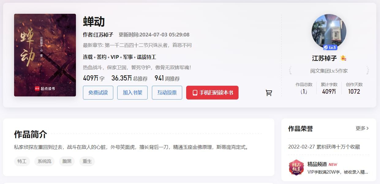 小说发布于2021年6月16日,到现在已经连载了3年的时间,总字数有409万,连载至1288章。现在作者平均每天更新一千字,完结应该还要一段时间。