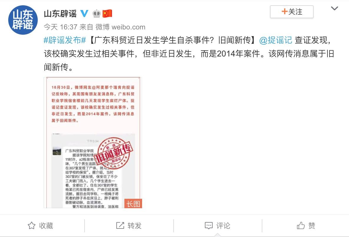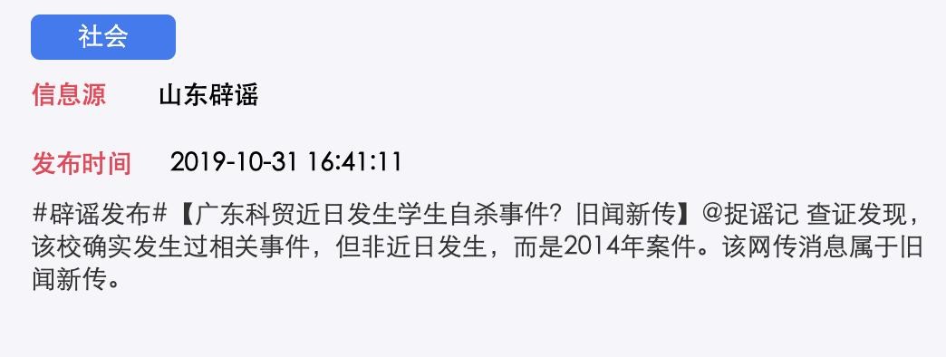 AI识谣系统在经过智能收集分析网络讯息后获知,今日16时37分许,山东省互联网违法和不良信息举报中心即通过其官方微博“山东辟谣”针对上述消息进行了辟谣:“广东科贸近日发生学生自杀事件?旧闻新传!捉谣记查证发现,该校确实发生过相关事件,但非近日发生,而是2014年案件。该网传消息属于旧闻新传。”