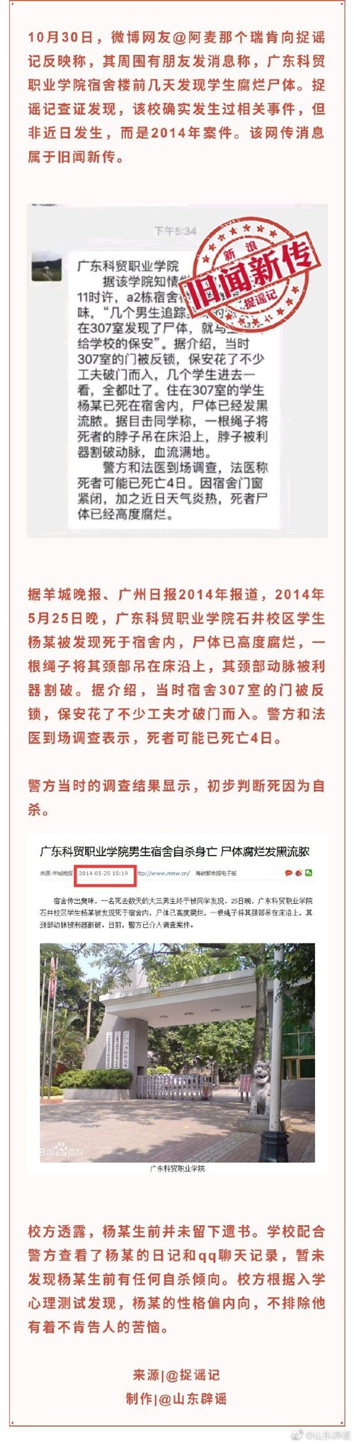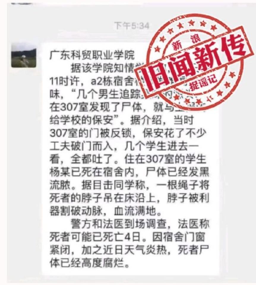 近日,一则有关“广东科贸职业学院发生学生自杀事件”的传闻在微博微信等互联网平台流传,该传闻称广东科贸职业学院宿舍楼前几天发现学生腐烂尸体,引发不少网友关注。
