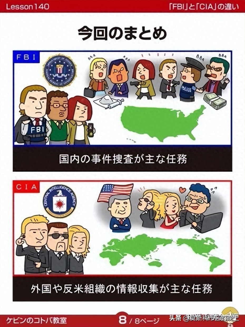 这是日本人的解释,可以理解为FBI负责在美国境内调查刑事案件,CIA在美国境外搜集外国情报:
