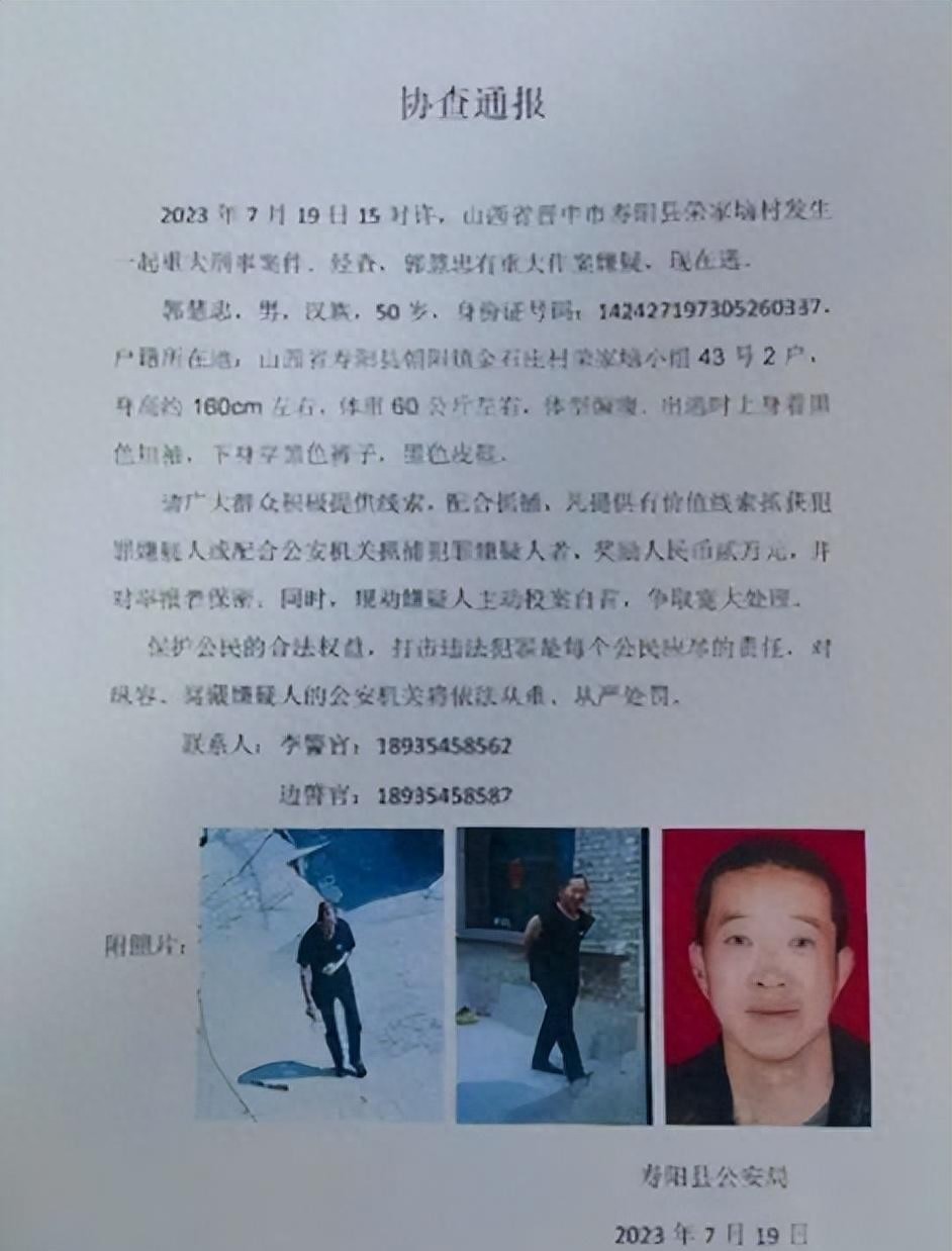 在山西省晋中市寿阳县,发生了一起令人震惊的刑事案件。一名叫郭某的男子被抓获,案件在民间被称为“7.19”案。这个案件发生在2023年7月19日下午,地点是寿阳县荣家垴村。事发现场发生了一起血腥的悲剧,郭某持刀杀害了他的妻子、儿子、女儿和岳父,导致4人丧生,然后携带财物逃离现场。这个家庭悲剧引起了广泛的社会关注和愤怒。