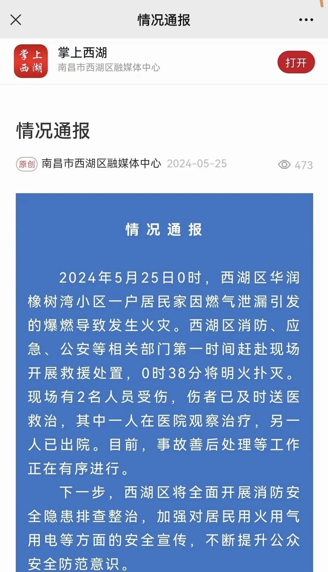 大皖新闻记者注意到,25日晚间,南昌市西湖区融媒体中心发布了“情况通报”:5月25日0时,西湖区华润橡树湾小区一户居民家因燃气泄漏引发的爆燃导致发生火灾,西湖区消防、应急、公安等相关部门第一时间赶赴现场救援处置,0时38分将明火扑灭,现场有2名人员受伤,伤者已及时送医救治,其中一人在医院观察治疗,另一人已出院,目前,事故善后处理等工作正在有序进行。