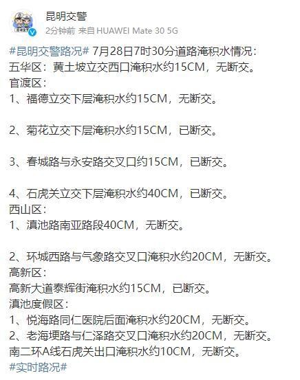 截至7月28日7时30分,昆明市主城区道路浸水情况如下: