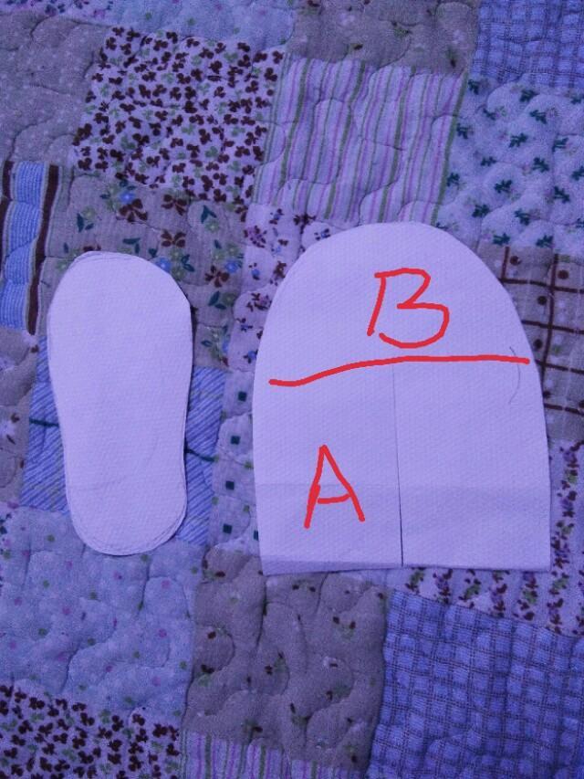 1、根据宝宝脚的大小画出鞋底,也可以根据现有的鞋子画。鞋面画一个长的半椭圆型,可以画一个半圆,再延长半圆的两侧。A部分可以画的长一些,这样多余的部分可以剪掉,这样就不用担心鞋样面与鞋底合不合适的问题了。