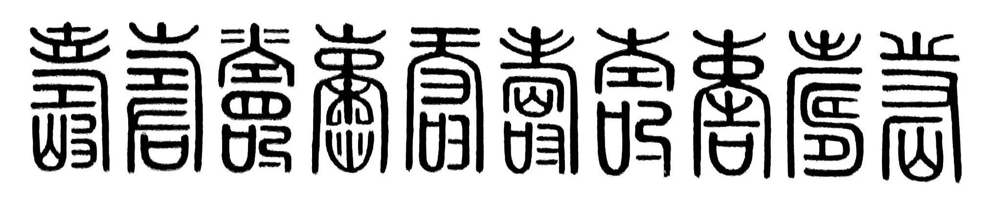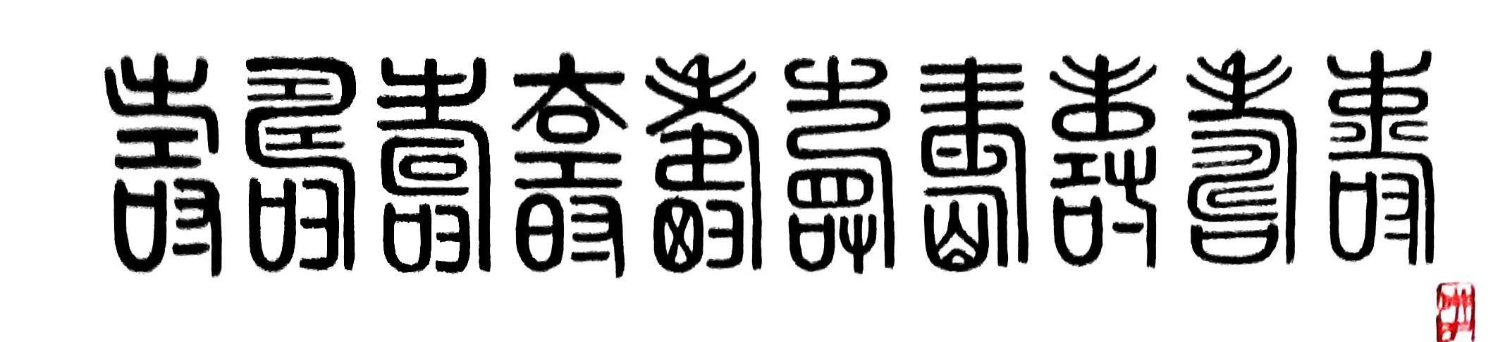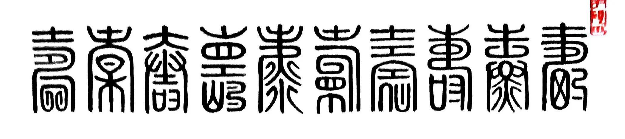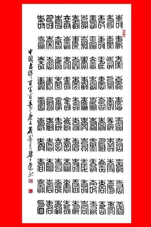 广东茂名籍书法家梁土荣先生创作的书法作品《百寿图》,以不同形体的100个篆体“寿”字组合而成,排列得整整齐齐.书写得端端正正,产生一种独特的艺术效果,给人以富丽堂皇、意蕴深长的感觉,深受广大书法爱好者青睐,也成为后辈馈赠老人家珍贵的生日礼物。以下为梁土荣的篆体书法作品《百寿图》的局部展示: