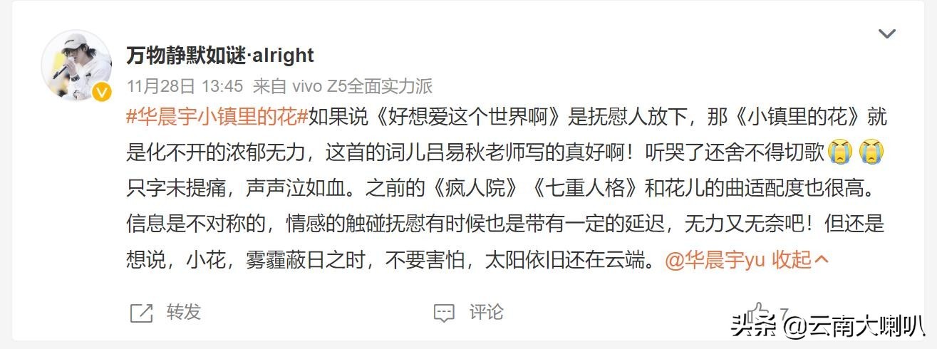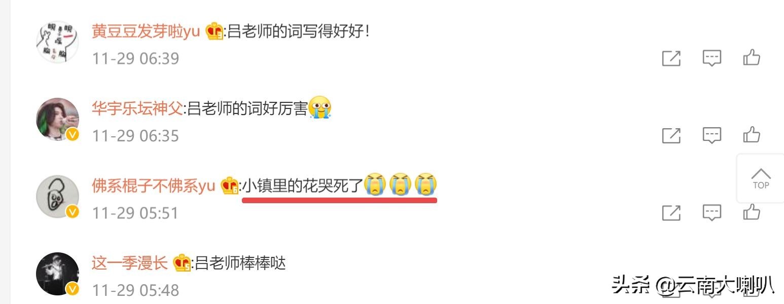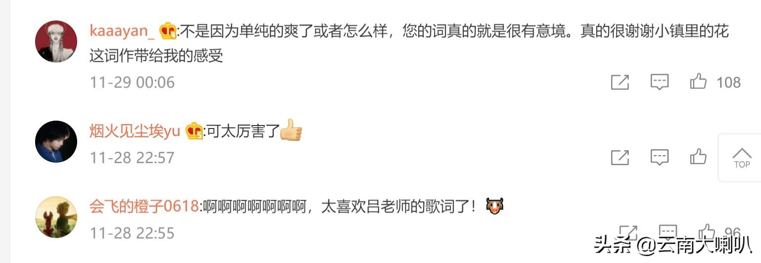 前面已经说过,吕易秋这三首词作已经被花花的歌迷们夸成了三朵花,而其中《小镇里的花》则是被提到最多的一首作品。有歌迷称,看这首歌词时,都忍不住哭了。