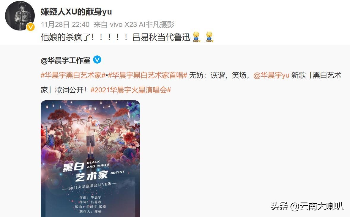 “从极俗到极雅,从吐槽到包容。写了一些新的气象,祝圆满。”据吕易秋发布的博文显示,华晨宇此次演唱会中的三首新歌都是出自他的手。而在他这条博文的评论区,都是清一色的赞美之词。