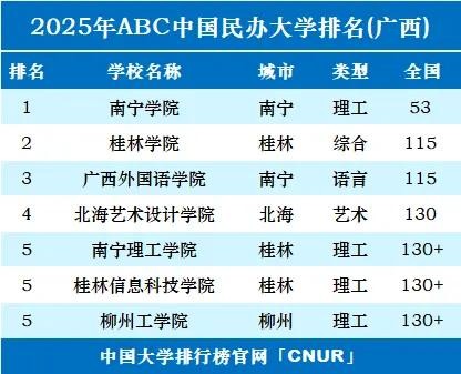 2025年ABC中国民办大学排行榜(广西地区)近日正式发布,这份由权威教育评价机构中国大学排行榜官网(CNUR)编制的榜单,展现了广西民办高等教育发展的新格局。
