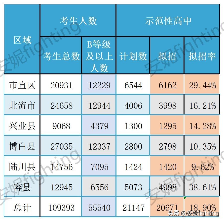 2024年玉林市示范性高中拟招人数及占县区考生总数百分比