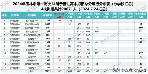 2024年玉林市第一批次14所示范性高中拟招总分等级分布表