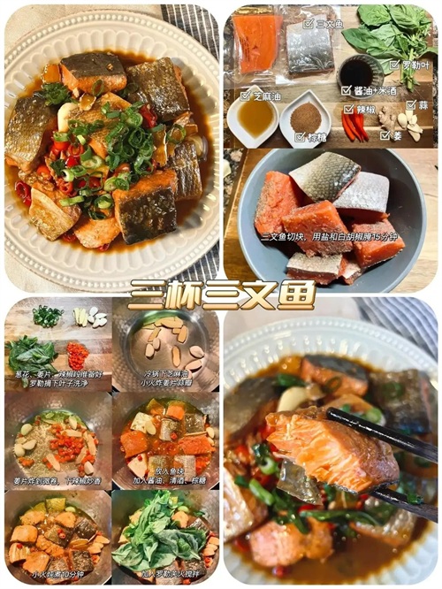 调料:罗勒叶+酱油+芝麻油+棕糖+三文鱼+辣椒+蒜+姜
