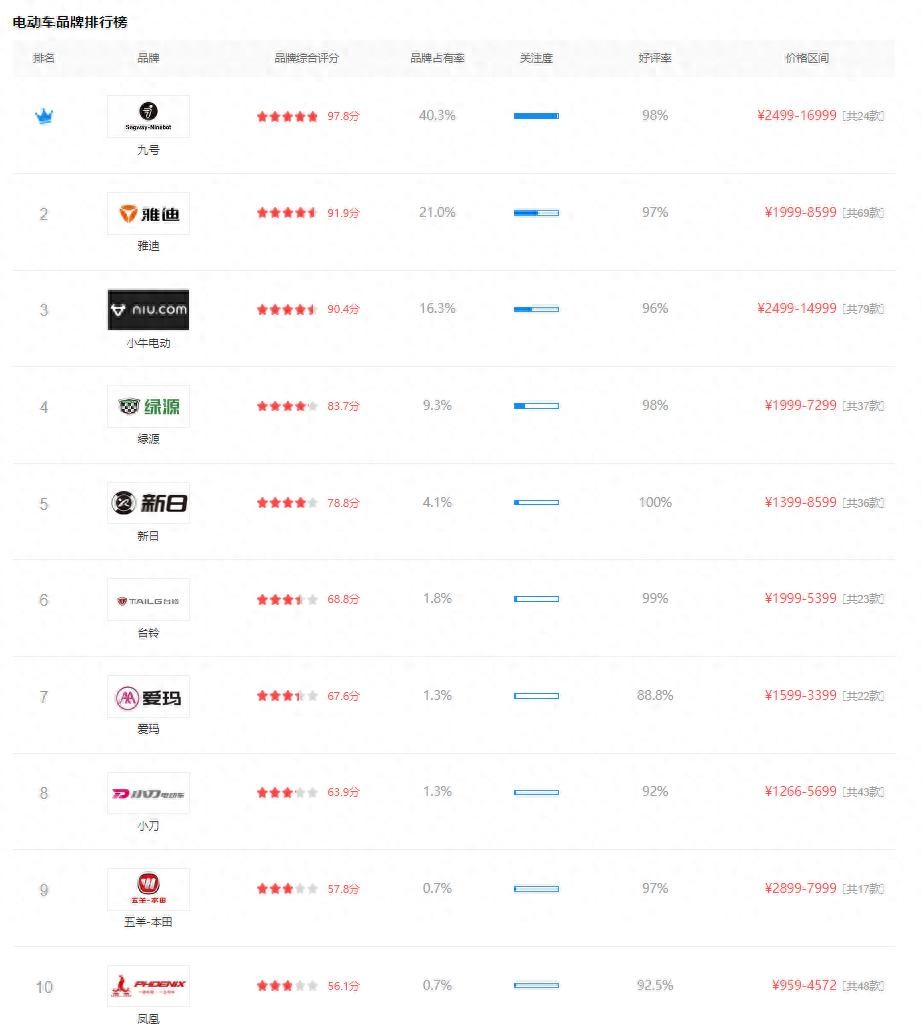 1. 九号电动车:位居关注度榜首,以97.8分的品牌综合评分遥遥领先。产品体验优越,赢得了用户好评,如九号F90M,续航里程高达90公里,配备前后双碟刹、五级可调式减震、TCS牵引力控制系统、HHC坡道驻车、OTD单转把模式等优势功能;智能化水平行业领先,吸引了众多年轻用户。
