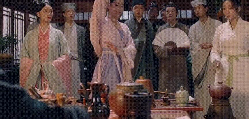 还有那一场“点茶比斗”的重头戏,一边舞蹈,一边点茶,更是以“击拂”奏出彷如“拂琴”的动听声音,惊艳众人。而后又以惟妙惟肖的“茶百戏”赢得最后胜利,为大家还原了一场浪漫又精致的宋代茶美学。