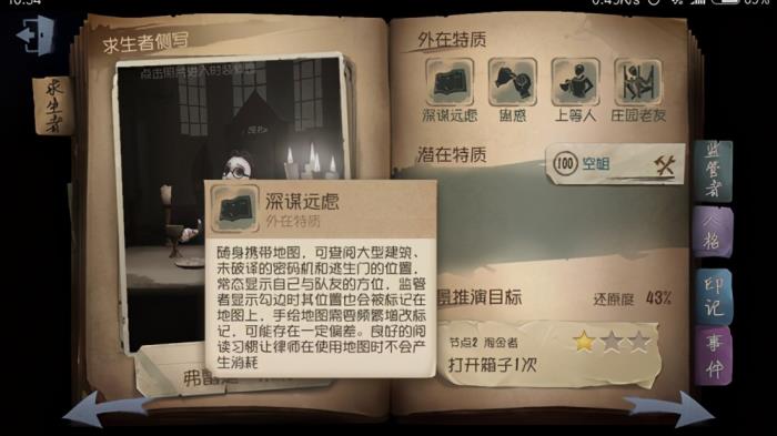 随身携带地图,可查阅大型建筑,未破译密码机和逃生门的位置,常态显示自己与队友的方位,监管者显示勾边时也会被标记在地图上,律师使用地图不会产生消耗。
