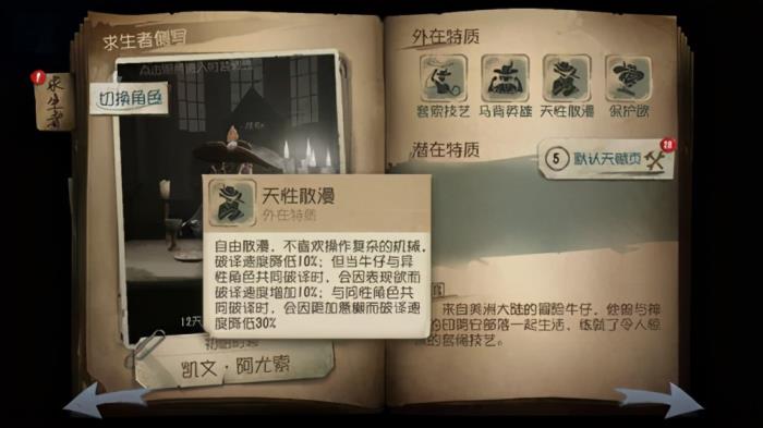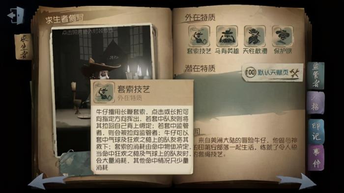 牛仔毕竟也是会骑马的,所以天生比较勇敢强悍,砸板对监管者造成的眩晕时间增加20%。跟前锋差不多,都是肌肉比较发达的家伙。