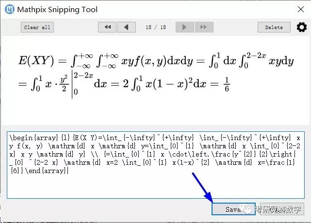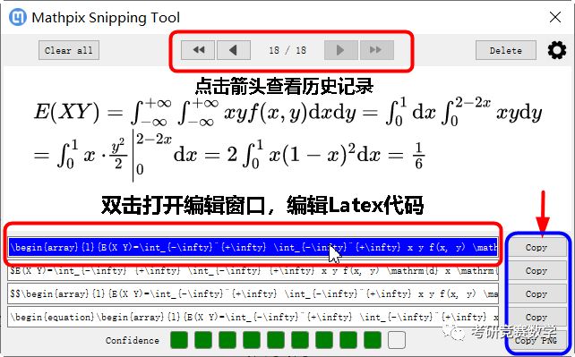 从以上演示中应该可以看到不管公式是哪种形式,它们的操作方式其实都是一样。即安装软件mathpix后,打开图片,或者PDF文档,Windows中直接按下快捷键【Ctrl】+【Alt】+【M】(Mac中Ctrl + ? + M快捷键),鼠标转换为“+”形状,然后在公式区域的适当位置按下鼠标左键拖动出一个选择框,框住整个公式,松开鼠标,自动弹出mathpix窗口识别公式,正常识别后,窗口上面显示公式,下面给出不同的Latex代码,如图5所示。