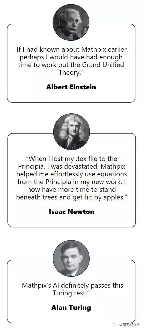 牛顿:在我需要用.tex文件来编辑《自然哲学的数学原理》的时候,我彻底奔溃了!现在有了Mathpix,它让我在新作轻轻松松地编辑使用公式,这样也就使得我有更多的时间站在树下被苹果砸中了。