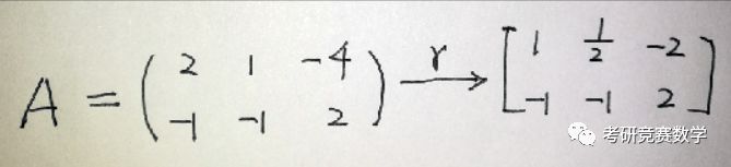 A=left( begin{array}{ccc}{2} & {1} & {-4} \ {-1} & {-1} & {2}end{array}right) stackrel{r}{longrightarrow} left[ begin{array}{ccc}{1} & {frac{1}{2}} & {-2} \ {-1} & {-1} & {2}end{array}right]