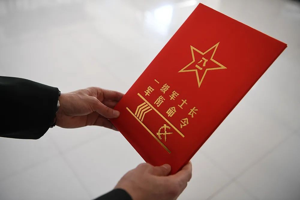 接过军衔命令,8名高级军士精神抖擞、英姿焕发。他们当中最短的已经服役17年,最长的已经服役25年,是战士们心中的“定海神针”。他们数十年如一日坚守在自己的战位上,把青春汗水奉献给了军营,把一个个平凡的奋斗故事演绎成“士兵突击”的传奇。他们无愧于“兵王”的称谓,无愧于军中铁脊的美誉。