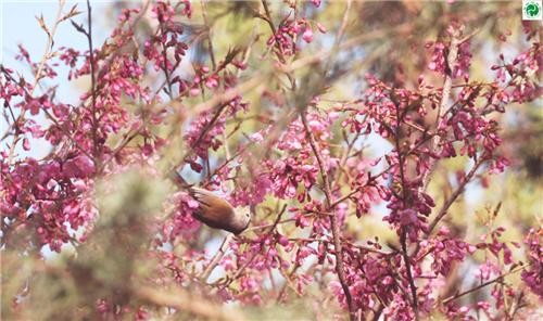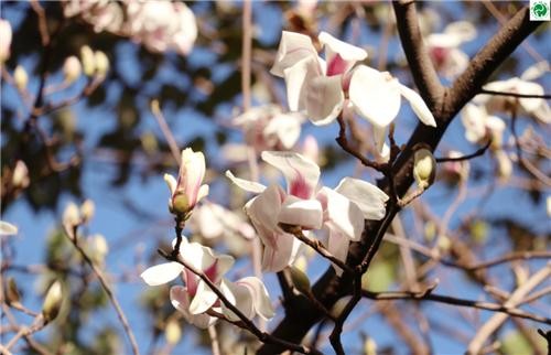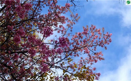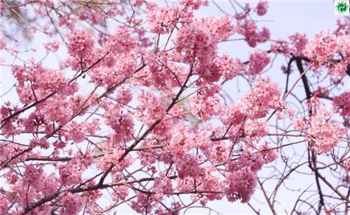 苍松翠柏与粉嫩的冬樱花遥遥相对,