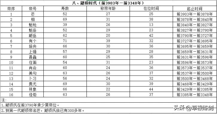 按《史记》记载,颛顼是意昌之子,黄帝的孙子,大禹的祖父。颛顼时代历经16位君主,555年。第一位君主也叫“芒”,在位25年,享年52岁。