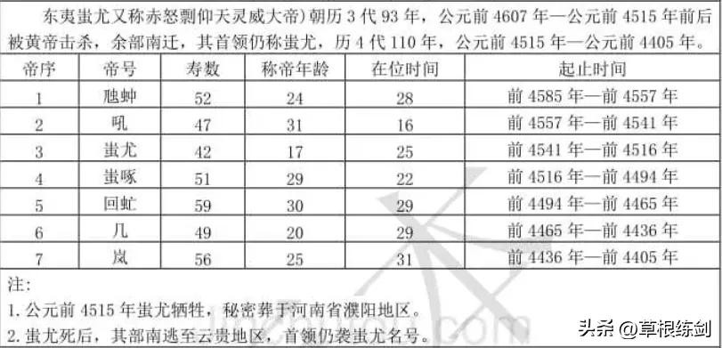 蚩尤部落历经7位君主,历时92年,第一代君主“虺蚛”在位28年,享年52年。
