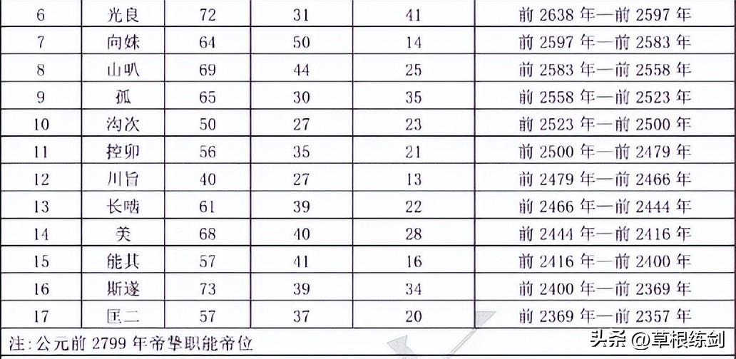 黄帝氏族历经15位君主,460年。第一位君主叫“芒”,在位31年,享年61岁。