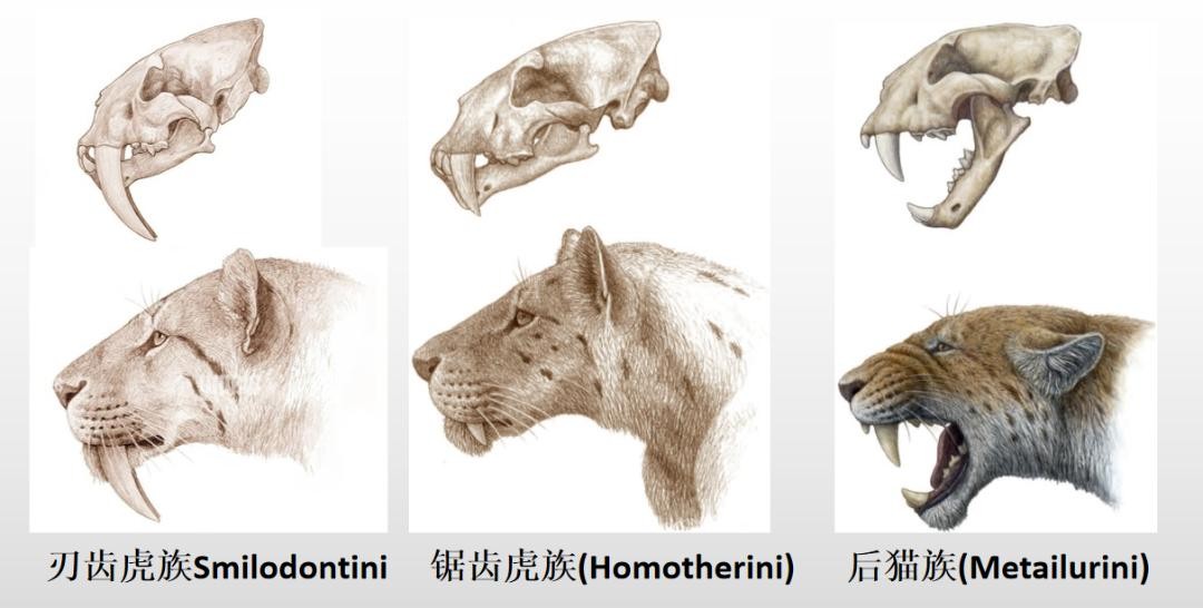 传统上,我们根据剑齿虎剑齿的形态和发育程度,将剑齿虎亚科分成三个族,分别是:刃齿虎族(Smilodontini)、锯齿虎族(Homotherini)和后猫族(Metailurini)。