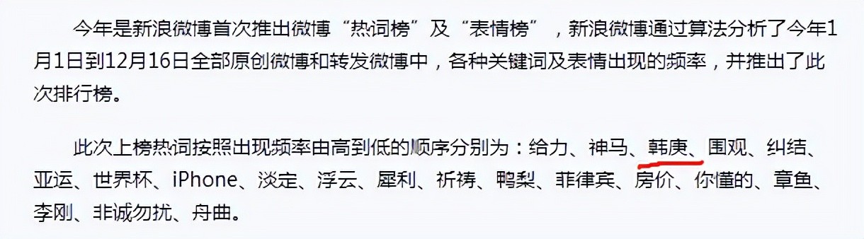 2010年,新浪微博在年末公布了十大热词,韩庚作为唯一的人名上了榜单,