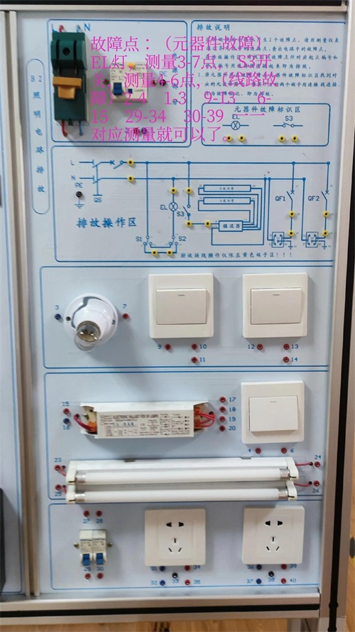 本图片共有三张图,第一张图是低压电工实操考试科目二双号板图片,在这里可以进行题目一 三相电动机点动电路接线,题目二 三相电动机自锁电路接线和题目三 三相电动机接触器联锁正反转电路接线。图片清晰便于观看。第二张图是低压电工实操科目二考试中的题目一 三相电动机点动电路的实际接线图和题目二 三相电动机自锁电路实际接线图。两个接线图画在了一起,便于大家学习。其中题目二 三相电动机自锁电路接线图只比题目一 三相电动机点动电路接线图多了两根蓝色的线。第三张图是与低压电工实操科目二考试双号板相对应的故障处理8个故障点的说明图片。图片上标注了,系统给的8个可能的故障点,我们要利用万用表的电阻档R*100或者R*1K档,对所给的故障点进行一一对应测量,最终找到2个真实的故障点,用导线把黄色的孔短接就可以了。8个故障中两个是元器件故障:灯和S3开关,六个是线路故障:2-4 1-3 9-13 6-15 29-34 30-39。