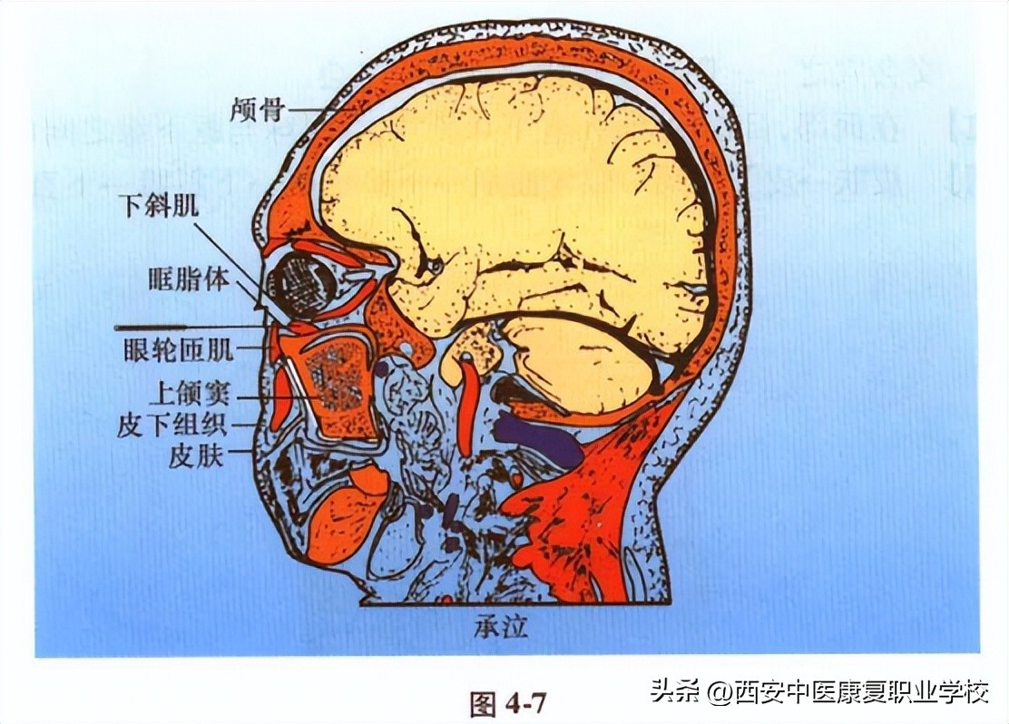 【穴位解剖】 皮肤→皮下组织→眼轮匝肌→下睑板肌→下斜肌→下直肌。皮肤由上颌神经的眶下神经分布。针穿皮肤、皮下组织以后,可经下睑板肌人眶内的下斜肌和下直肌。前肌为平滑肌受交感神经支配,后二肌是横纹肌,为动眼神经下支支配(图4-6)。