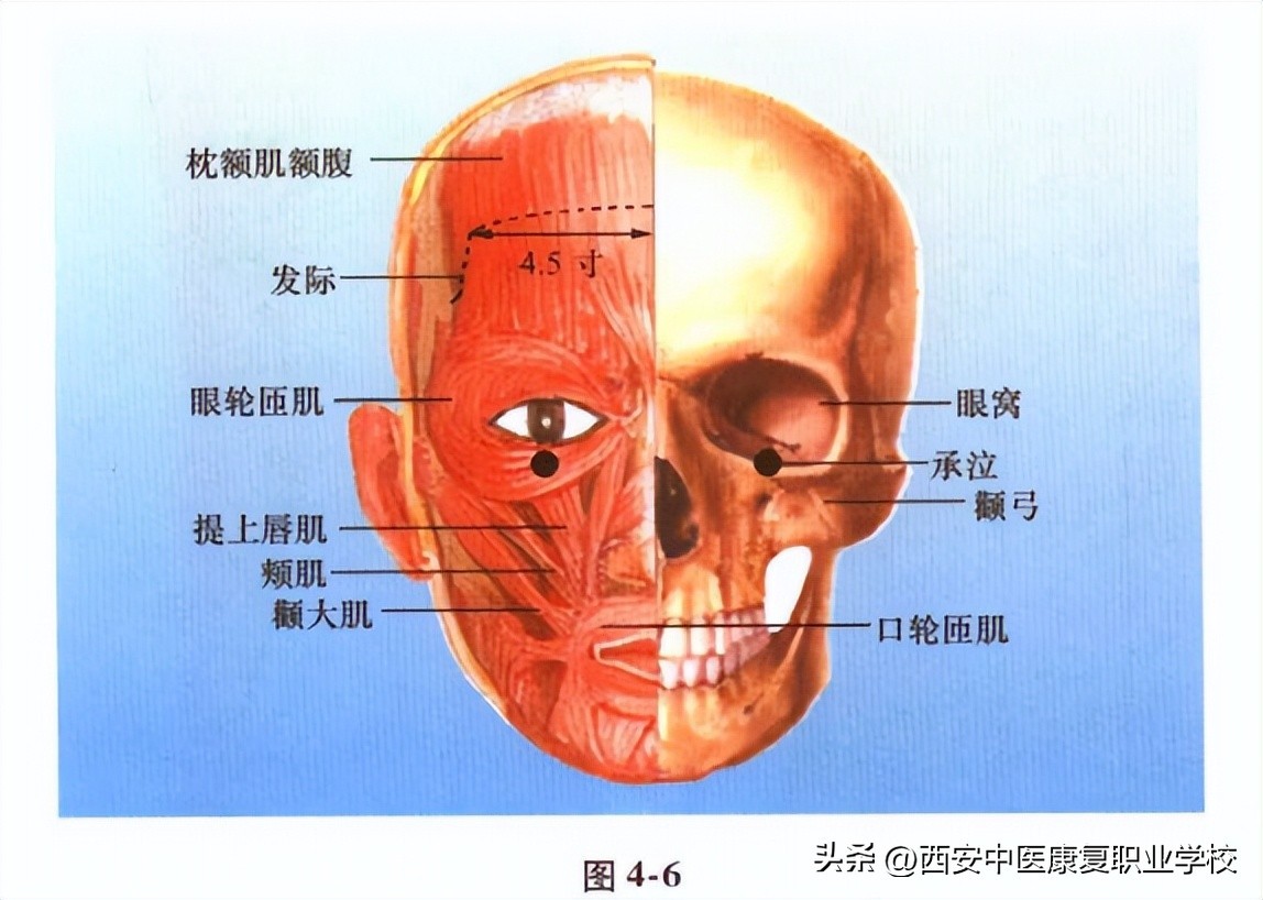 【标准定位】 在面部,目正视,瞳孔直下0.7寸,当眼球与眶下缘之间(图4-5)。