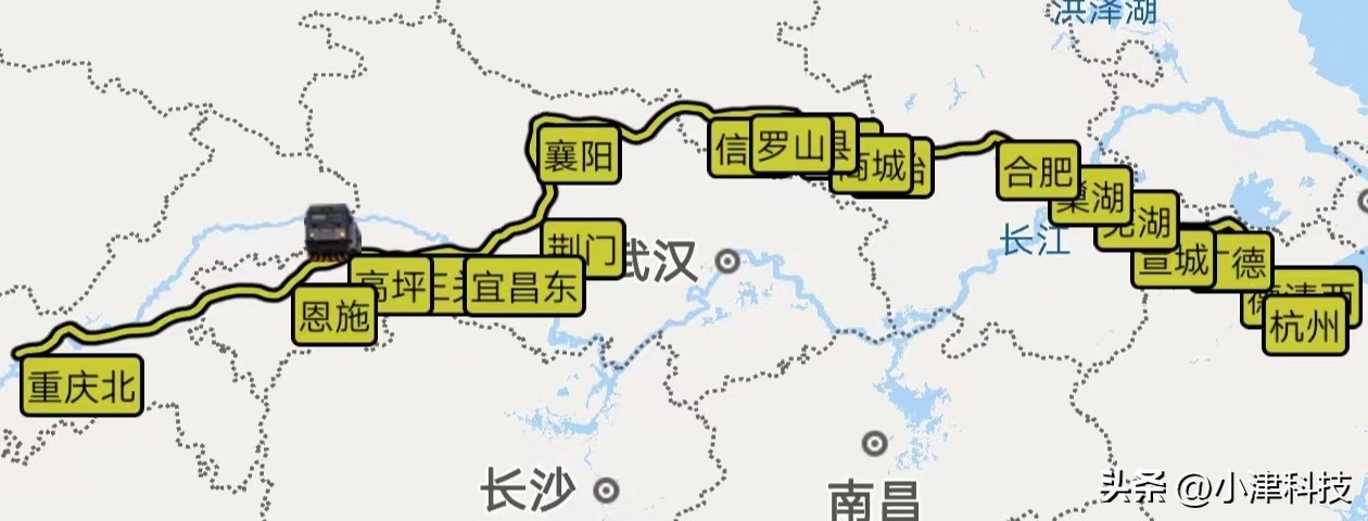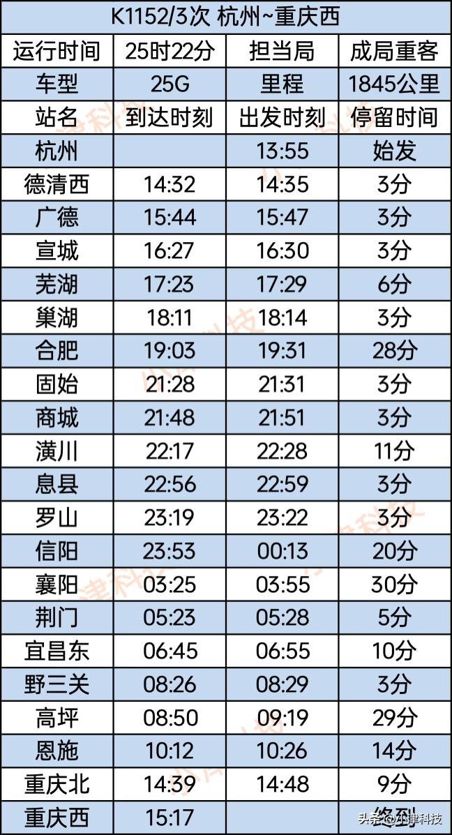 杭州站至重庆西站运行25小时22分,使用车次为K1152/1153次,经停杭州、德清西、广德、宣城、芜湖、巢湖、合肥、固始、商城、潢川、息县、罗山、信阳、襄阳、荆门、宜昌东、野三关(巴东站)、高坪、恩施、重庆北、重庆西。