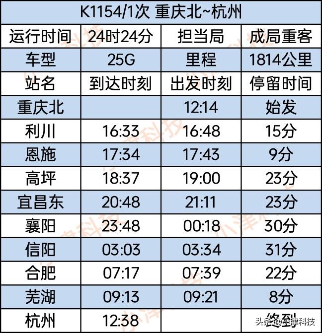 重庆北站至杭州站运行24小时24分,使用车次为K1154/1151次,经停重庆北、利川、恩施、高坪、宜昌东、襄阳、信阳、合肥、芜湖、杭州。