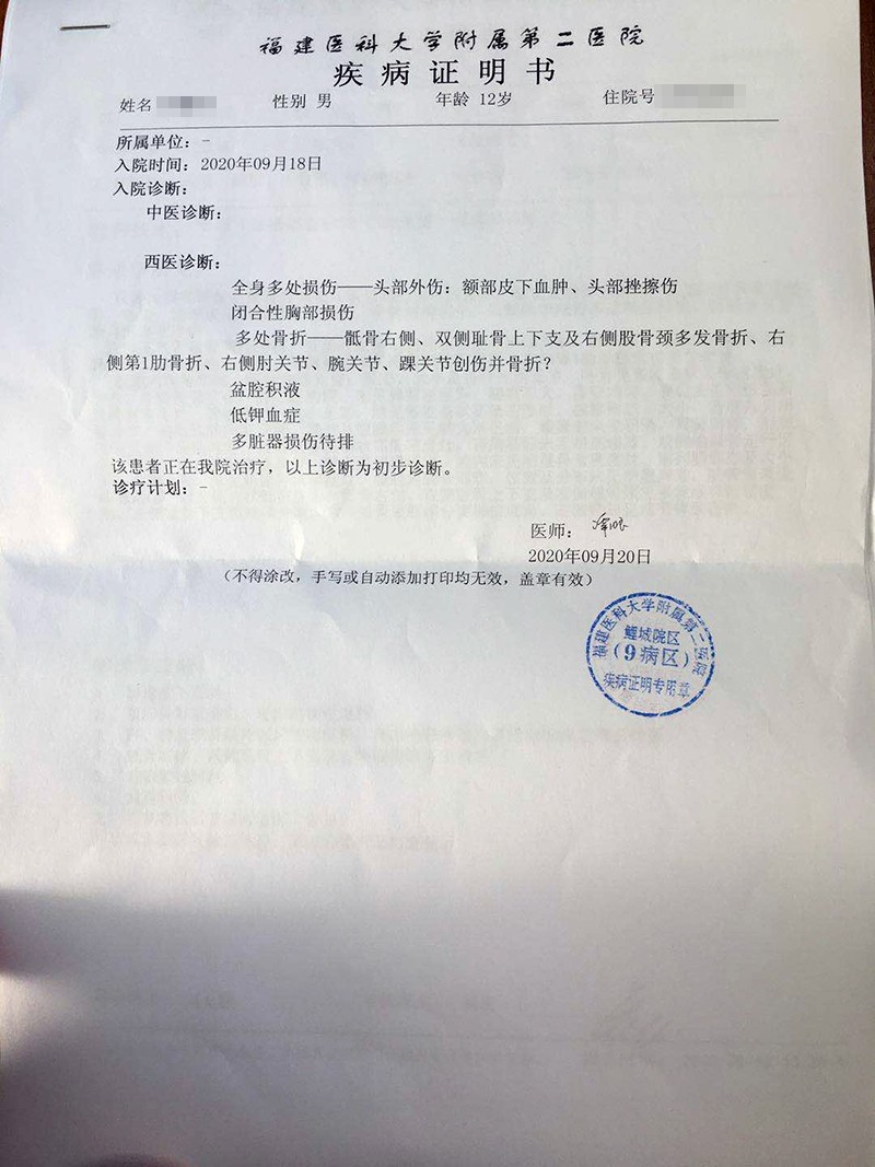 阿福跳楼后,学校老师拨通了120,医院出具的诊断书显示,阿福全身多处损伤、骨折、肺部积血。“腿废了,以后会落下终身残疾。”