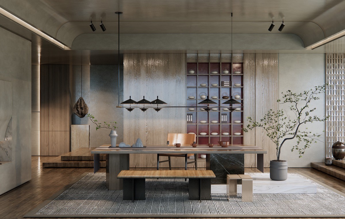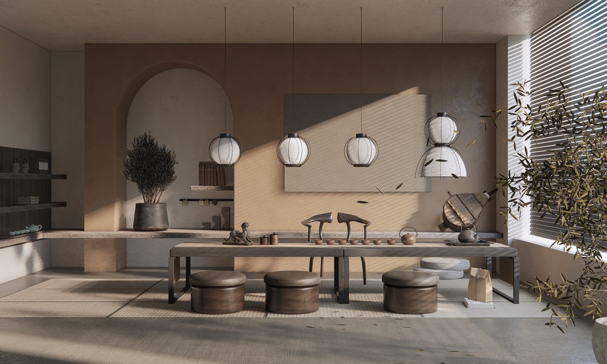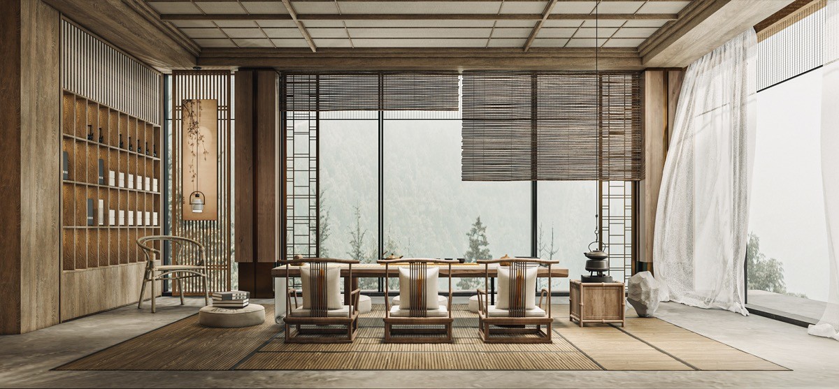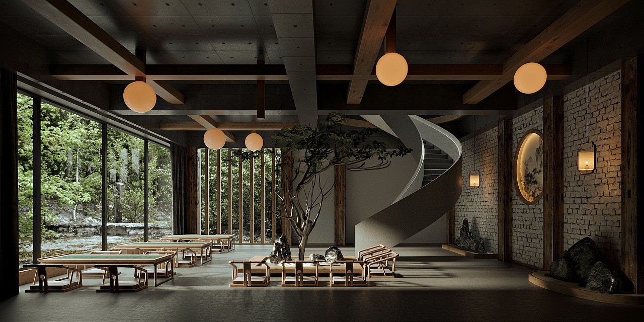 深红色、天然木材和黑色装饰将为现代室内设计带来一种过去的感觉,为茶室美学带来现代感。添加优雅的室内植物和小树,为丰富的背景增添活力。