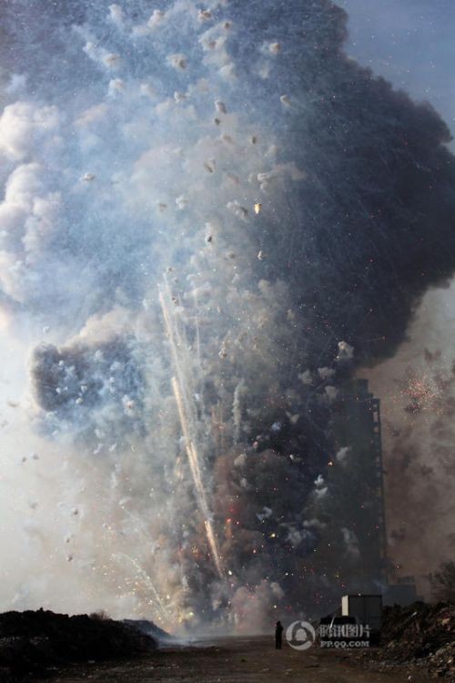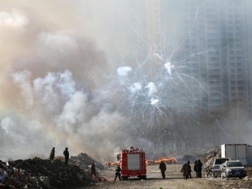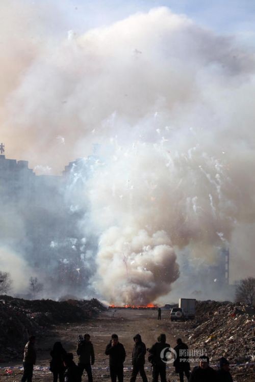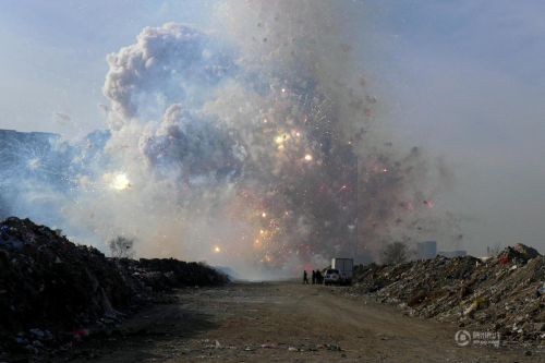沈阳警方销毁4515件非法烟花爆竹 现场浓烟滚滚