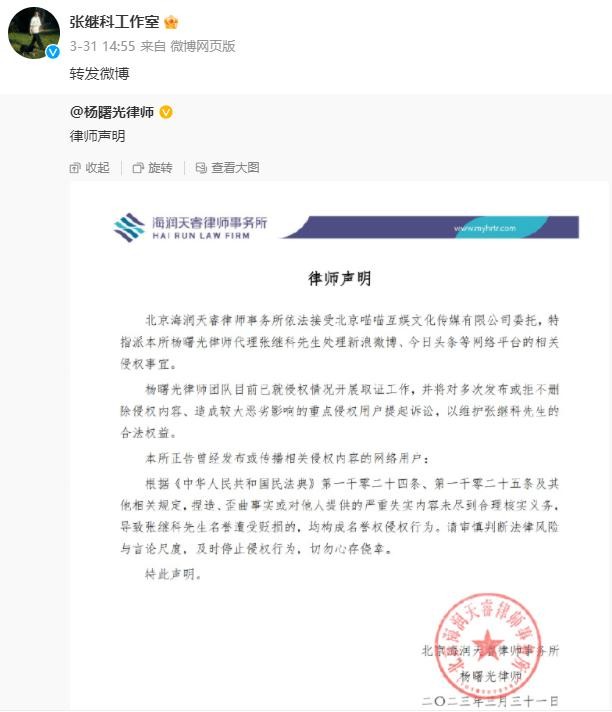 3月31日下午,@张继科工作室官方微博又转发了@杨曙光律师官方微博的声明。律师声明称,已代理张继科先生处理新浪微博、今日头条等网络平台的相关侵权事宜。律师团队目前已就侵权情况开展取证工作,并将对多次发布或拒不删除侵权内容、造成较大恶劣影响的重点侵权用户提起诉讼。