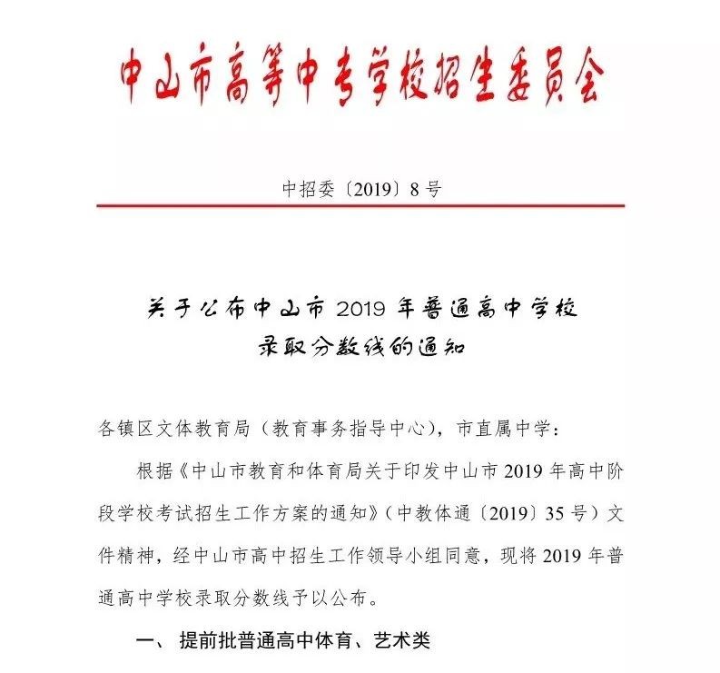 具体可见以下《关于公布中山市2019年普通高中学校录取分数线的通知》。