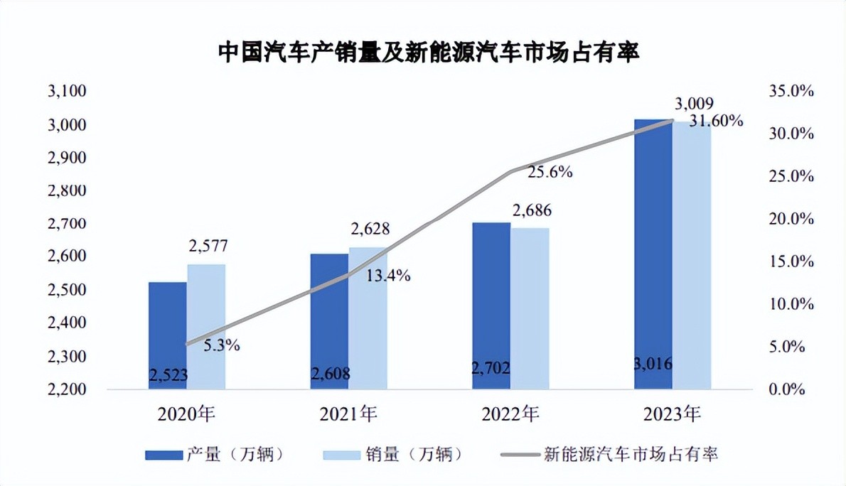 2023 年度,全国汽车产销分别为 3,016 万辆和 3,009 万辆,同比分别增长 11.6%和 12%,产销量创历史新高,实现两位数较高增长。新能源汽车继续保持快速增长,产销突破900 万辆,市场占有率超过 30%,成为引领全球汽车产业转型的重要力量。2024年 4 月以来,我国新能源汽车销售渗透率超过 50%,带动我国汽车产业成为国民支柱性产业。