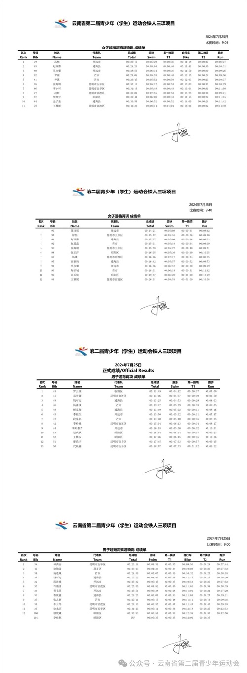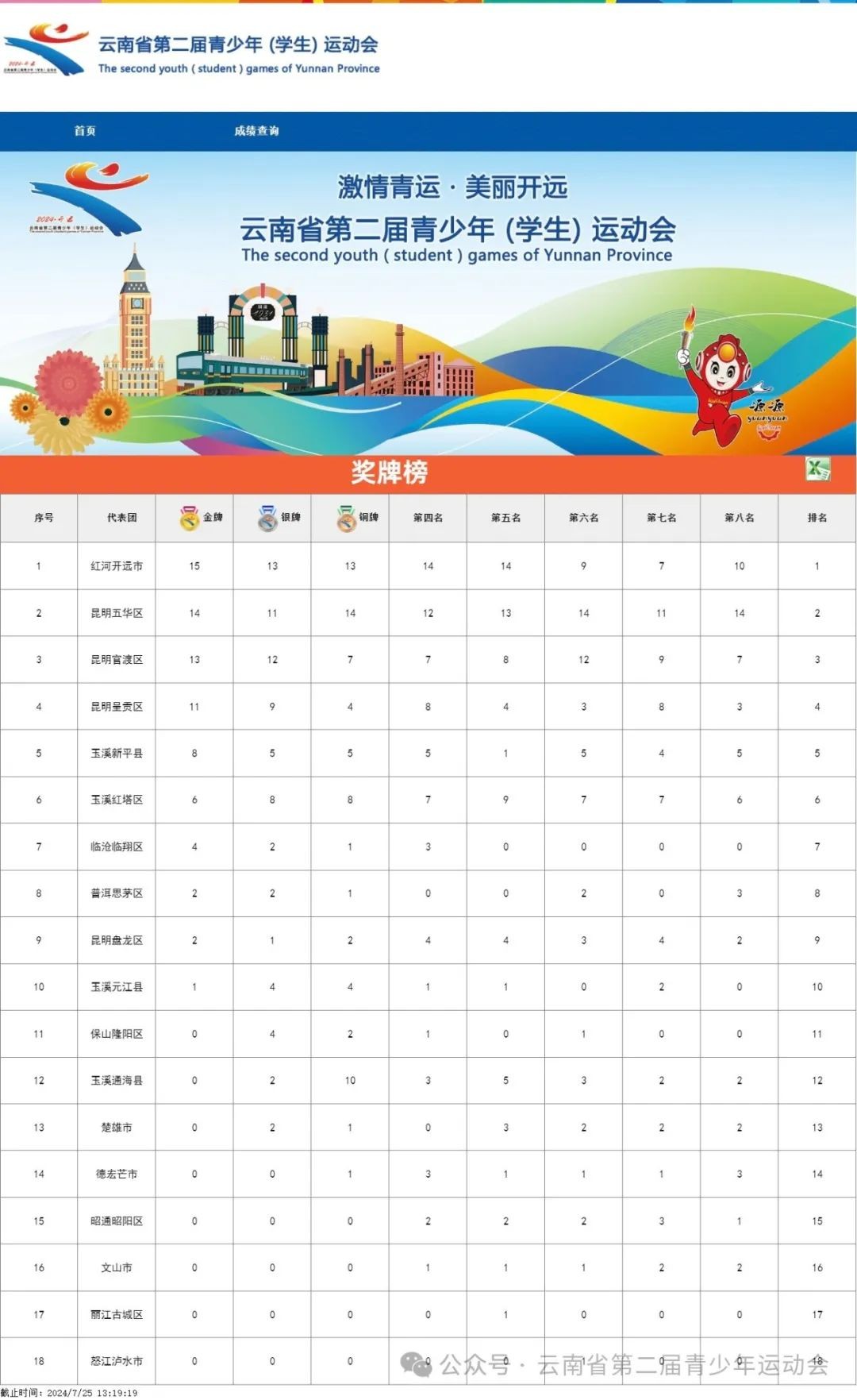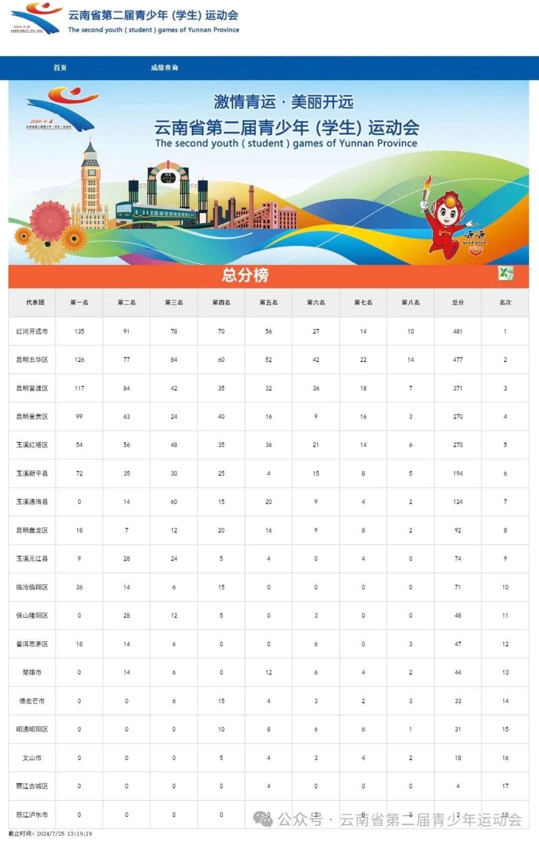 2024年7月25日,省“二青会”分别进行了射箭、铁人三项比赛。截止目前,奖牌榜前三名分别为红河开远市、昆明五华区、昆明官渡区;积分榜前三名分别为红河开远市、昆明五华区、昆明官渡区。