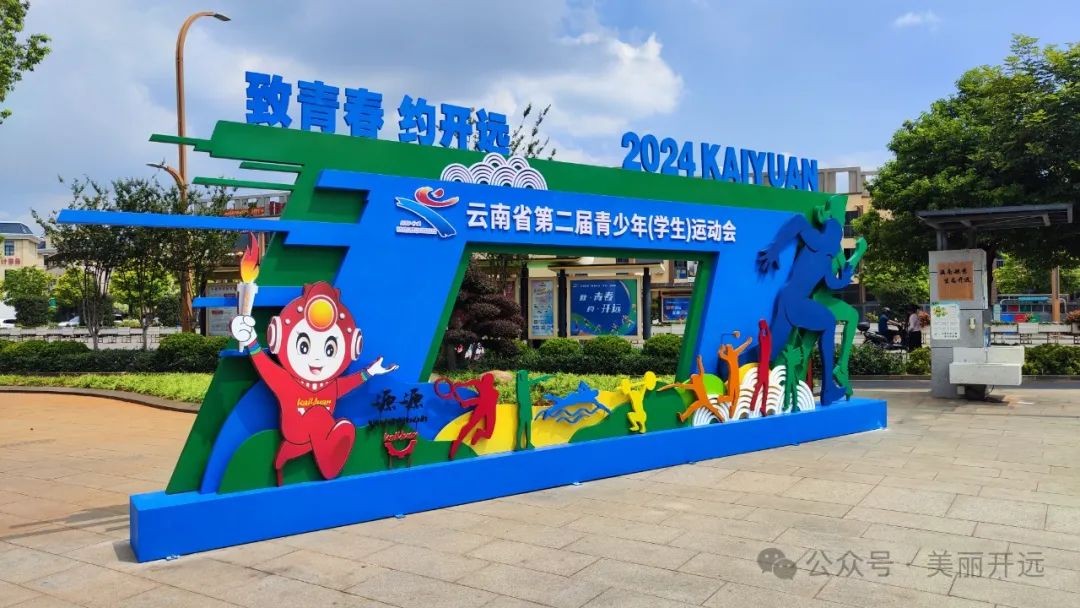 在市体育中心,“激情青运 美丽开远”的宣传标语随处可见,宽阔的运动广场上也布置了“致·青春 约·开远”的景观小品。