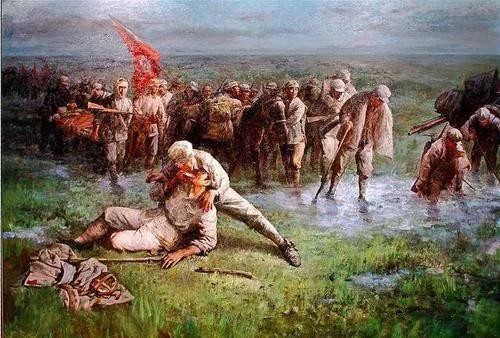 有一次战士们正在淌水过河,突然下起了大雨,河水开始猛涨,那滚滚而来讲尚在河中的不少人冲走并吞没。就这样,无数的红军战士躺尸草地,惨状令人悲痛。