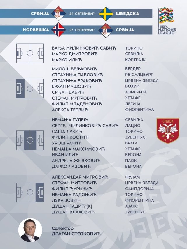 门将:德米特洛维奇(塞维利亚)、瓦尼亚·米林科维奇-萨维奇(都灵)、马尔科·伊利奇(科特赖克)