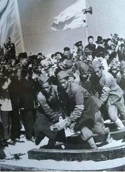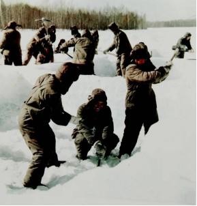 开发大兴安岭的铁道兵第三师战士破冰建桥