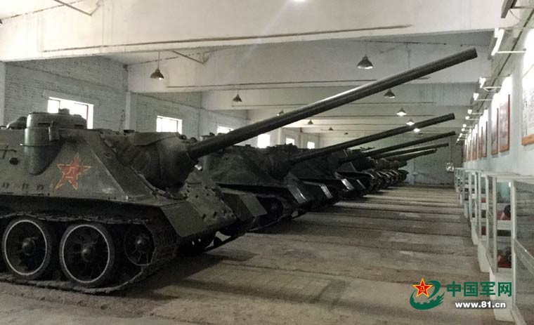 室内实车陈列室内,成列着各式中外坦克。其中包括两辆ИС-2重型坦克、两辆T-34/85中型坦克、一辆Su-100和三辆“斯图亚特”系列轻型坦克,还有Su-100和Su-76自行火炮等。