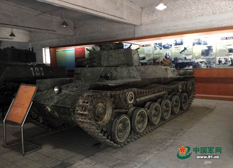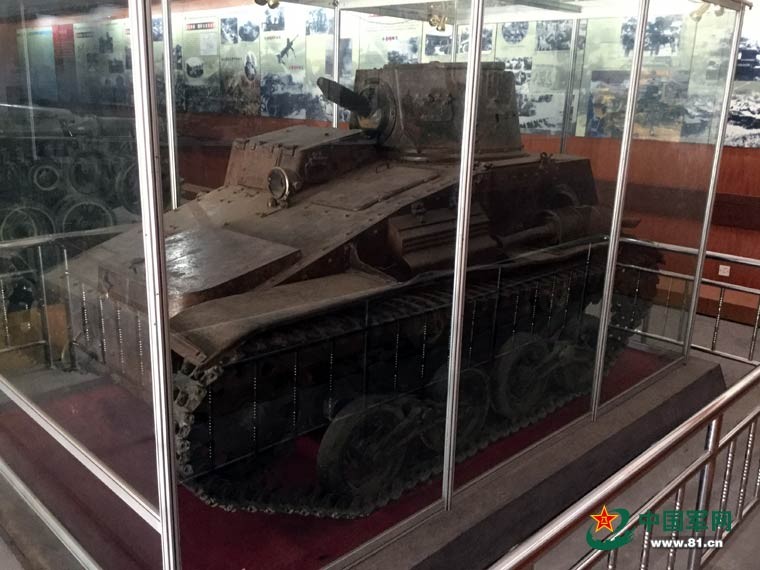 这辆日本94式超轻型坦克是坦克博物馆最为珍贵的藏品之一。据介绍,它的来历也十分富有戏剧性:该车于1989年7月由河北涿州市西围坨村农民王芬在大清河中发现,同年11月5日由解放军组织打捞出水。据当地民众和随车资料证实,该车隶属侵华日军独立第2坦克营的永山坦克队,是当年在参与进攻涿县-保定地区时通过由渡船搭设的浮桥过程中坠入水中的。该车在沉没河底52年后重见天日,据说是亚洲唯一一辆保存相当完好的94式超轻型坦克,堪称珍品。