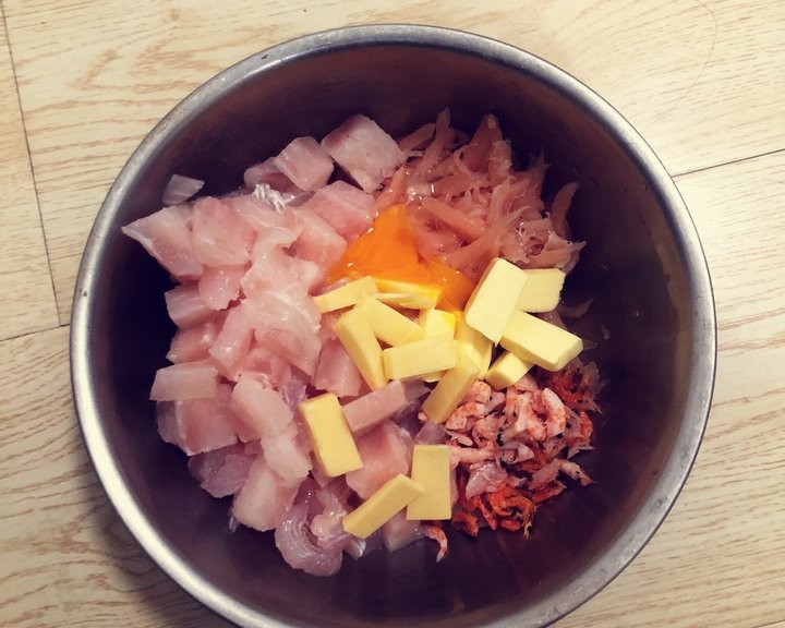 蛋黄2个,奶酪50克,鱼肝油少许,橄榄油少许,黄油少许